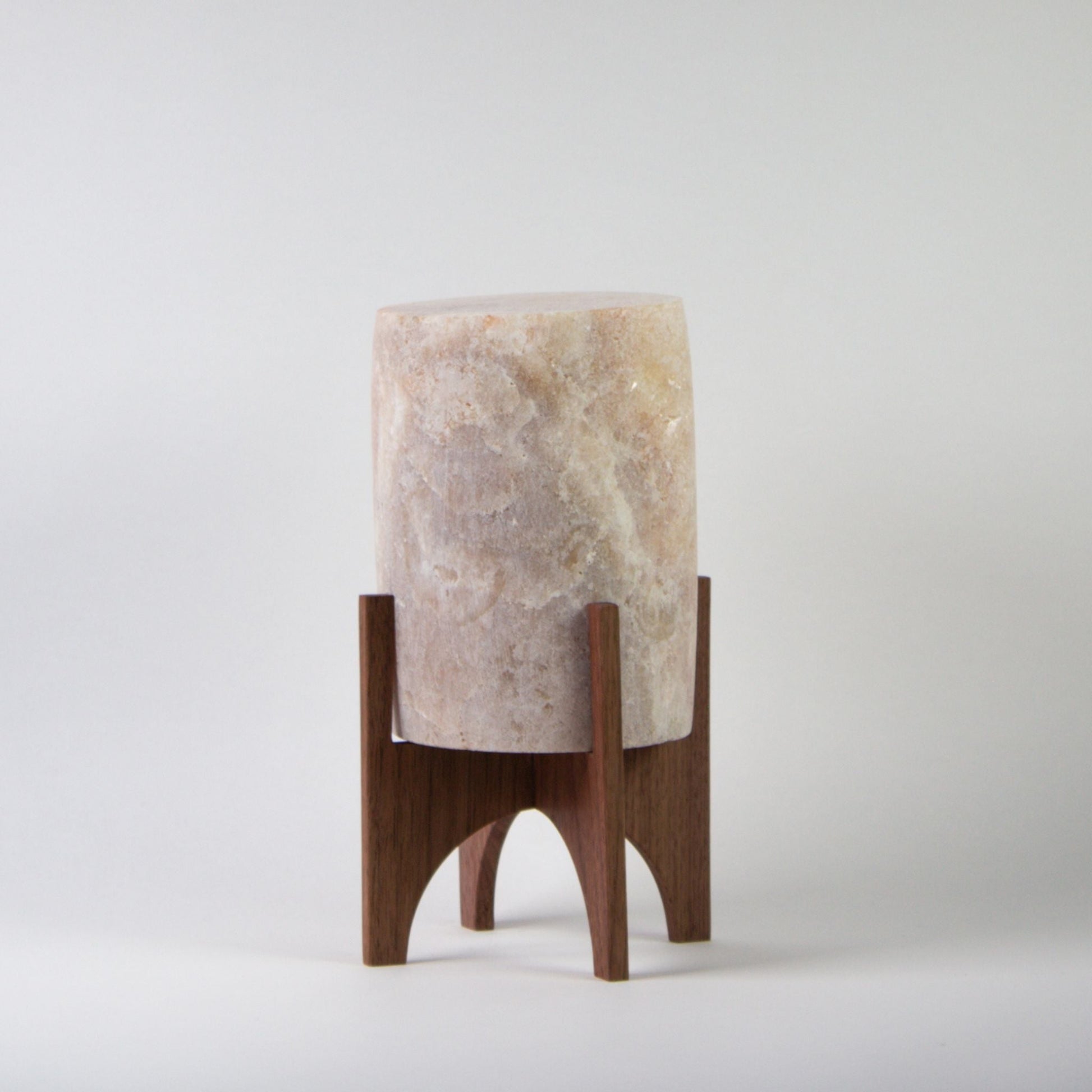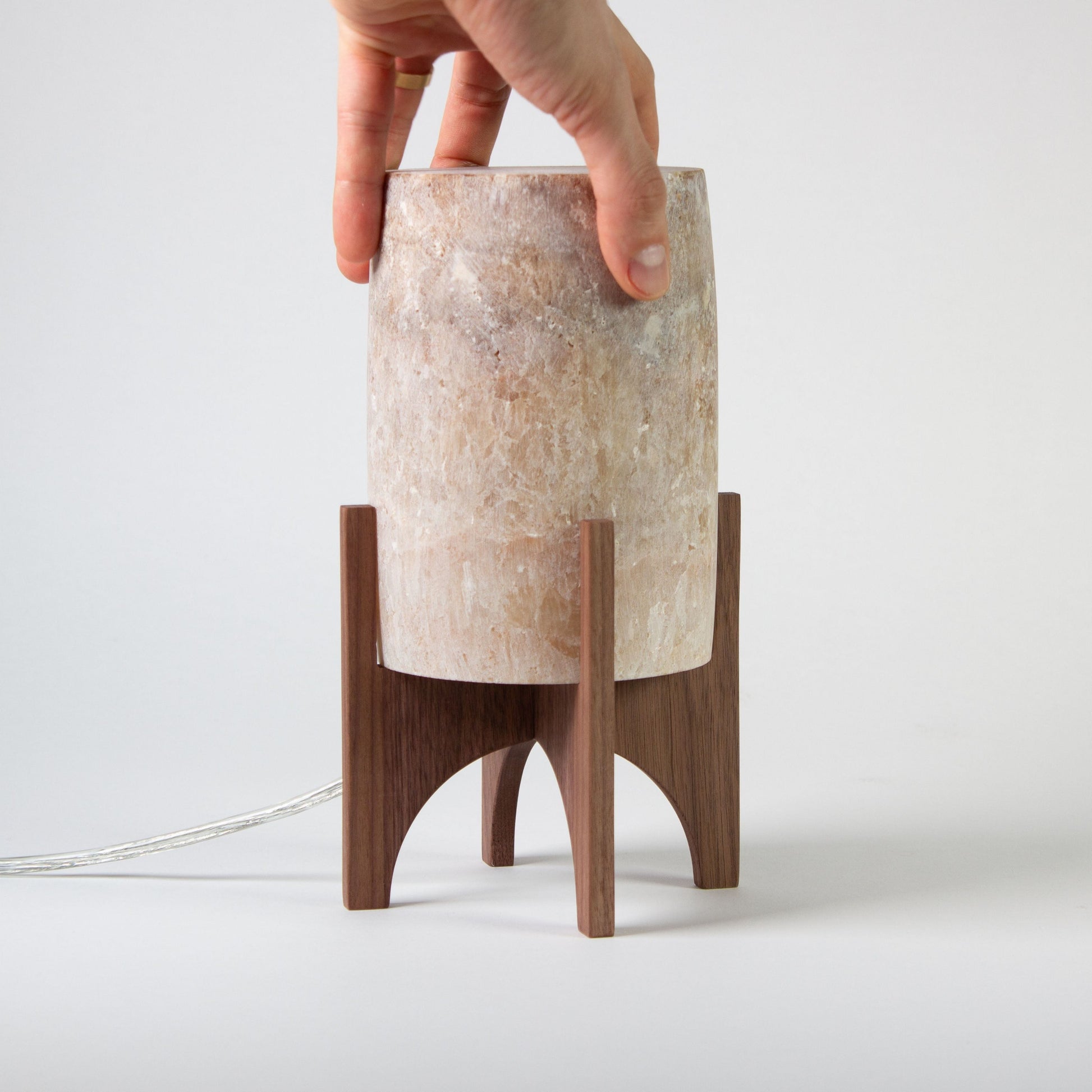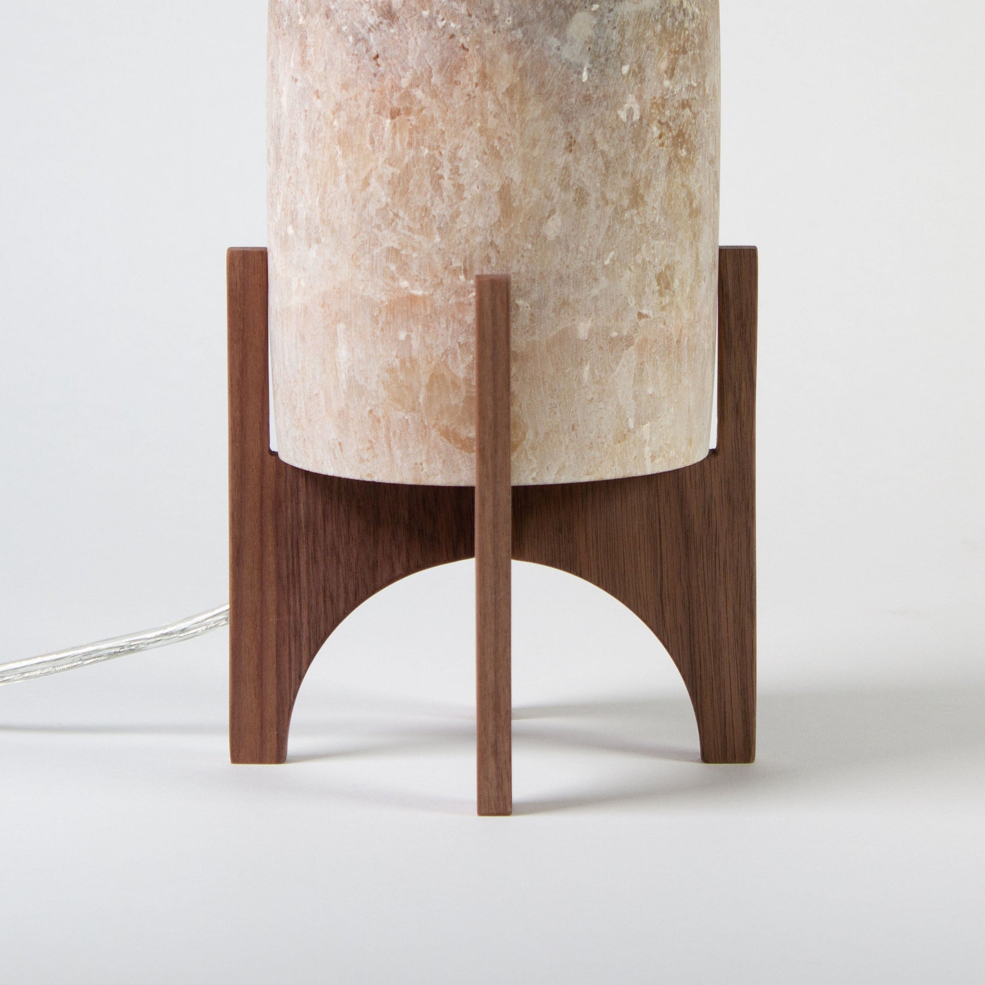 Comet pairs a hand-carved alabaster shade with a geometric walnut base, blending modern design with ancient craft. When lit, the alabaster’s soft glow reveals creamy hues and delicate veining, highlighting its natural beauty.
