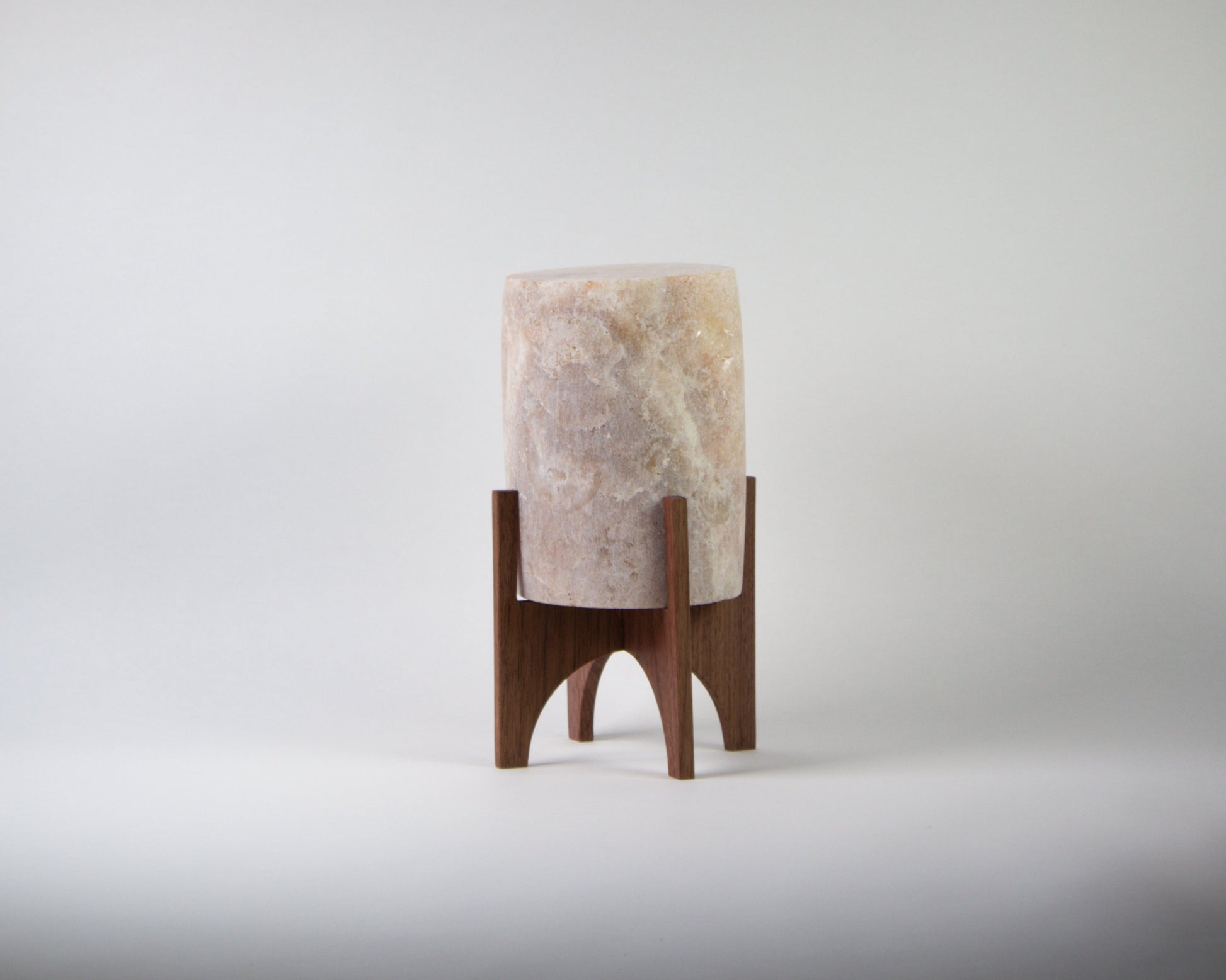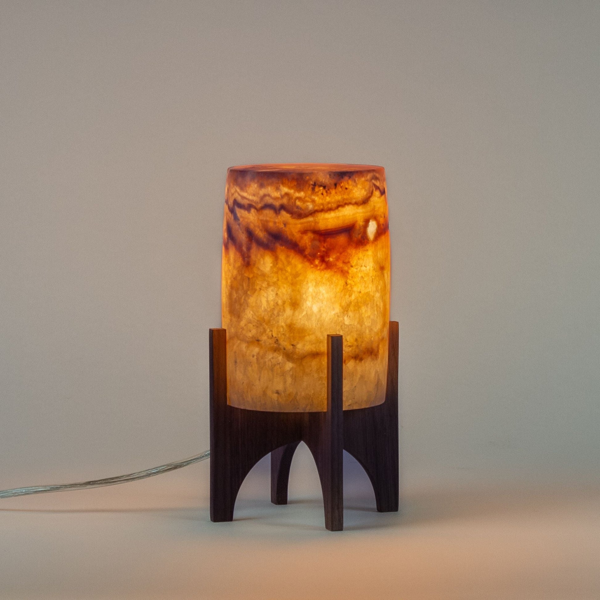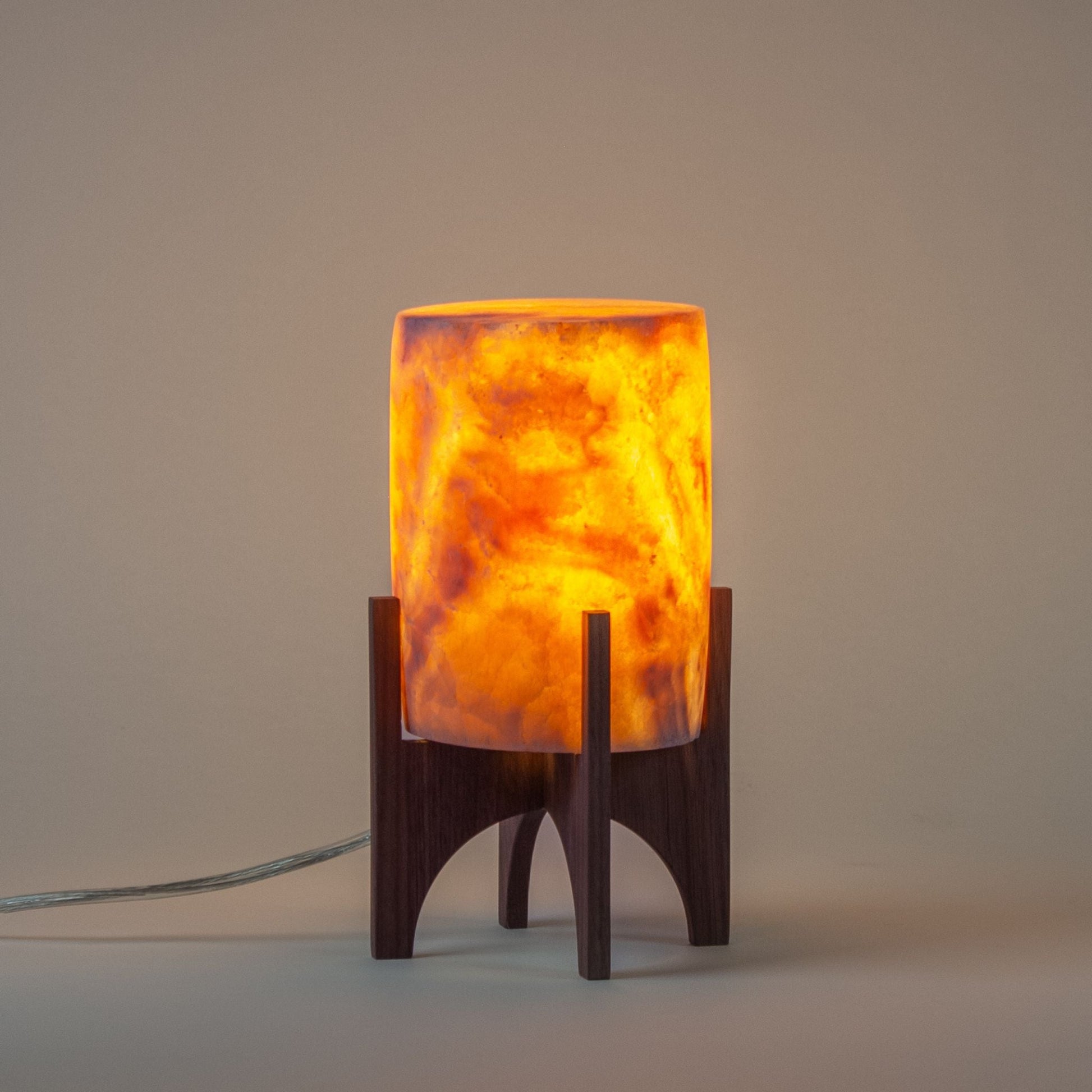 Comet pairs a hand-carved alabaster shade with a geometric walnut base, blending modern design with ancient craft. When lit, the alabaster’s soft glow reveals creamy hues and delicate veining, highlighting its natural beauty.