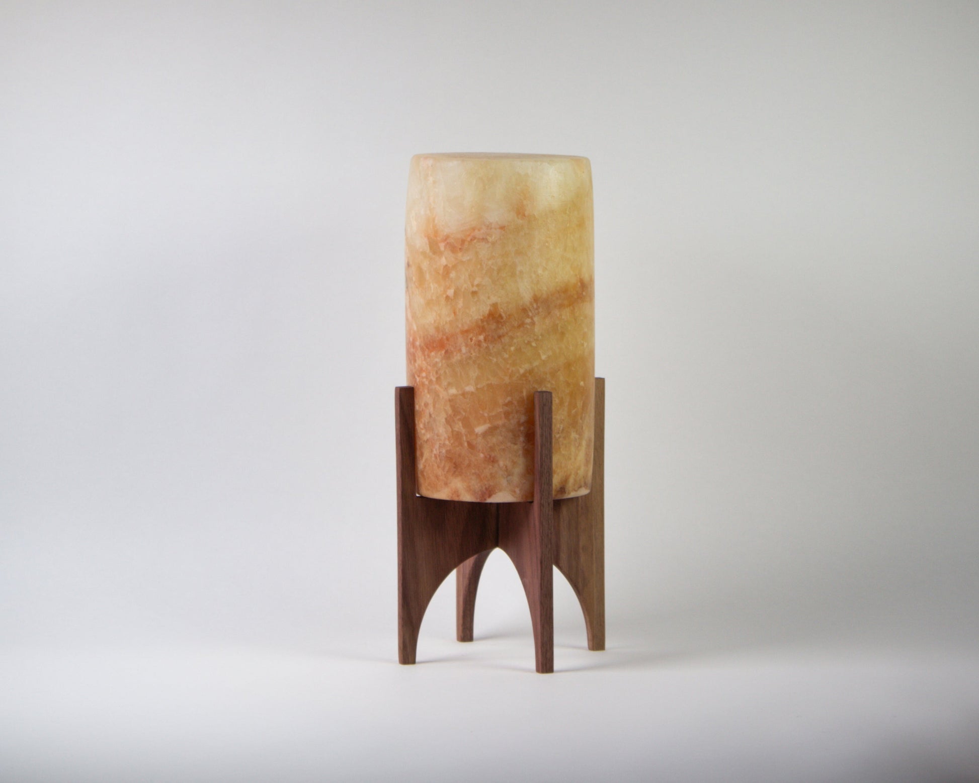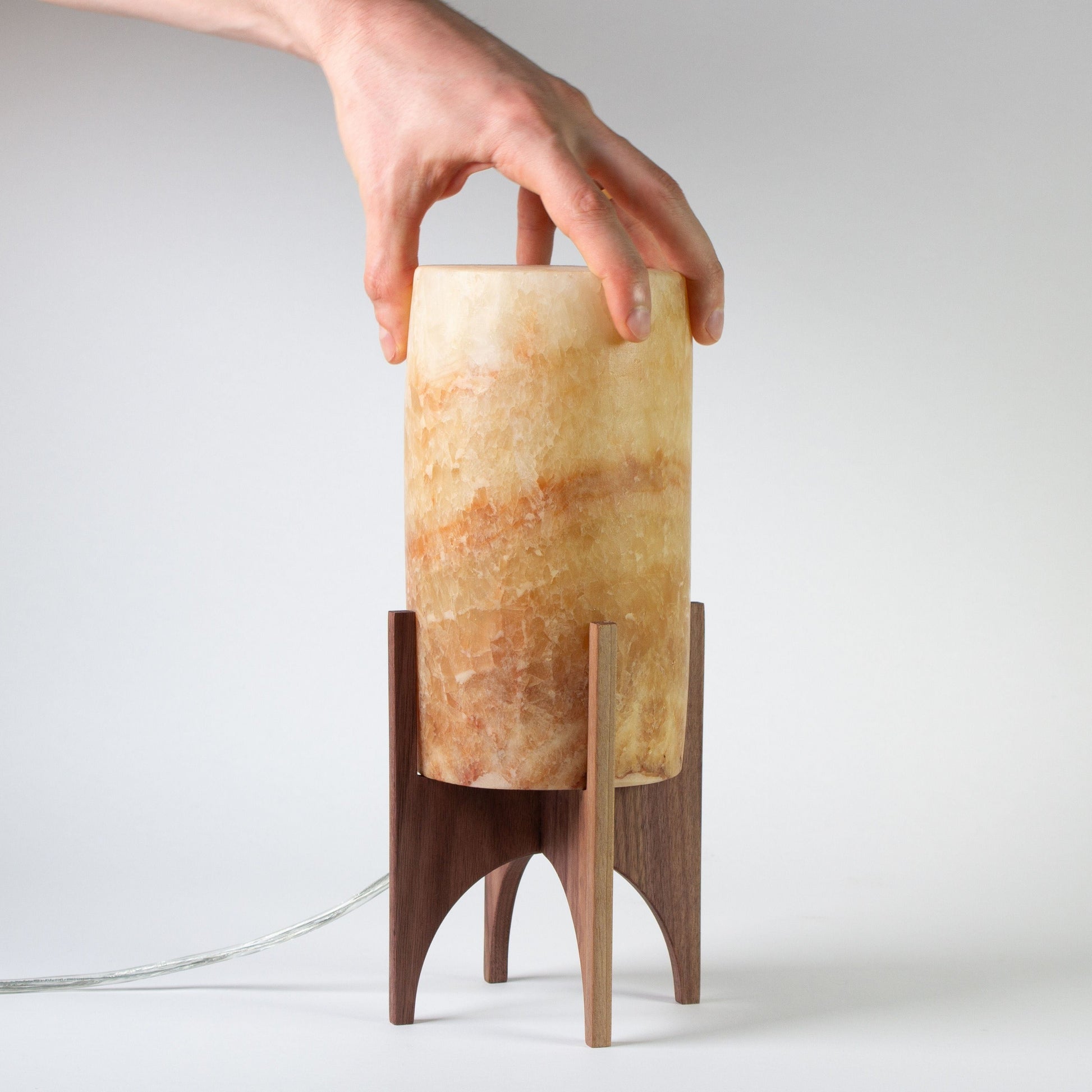 Comet pairs a hand-carved alabaster shade with a geometric walnut base, blending modern design with ancient craft. When lit, the alabaster’s soft glow reveals creamy hues and delicate veining, highlighting its natural beauty.