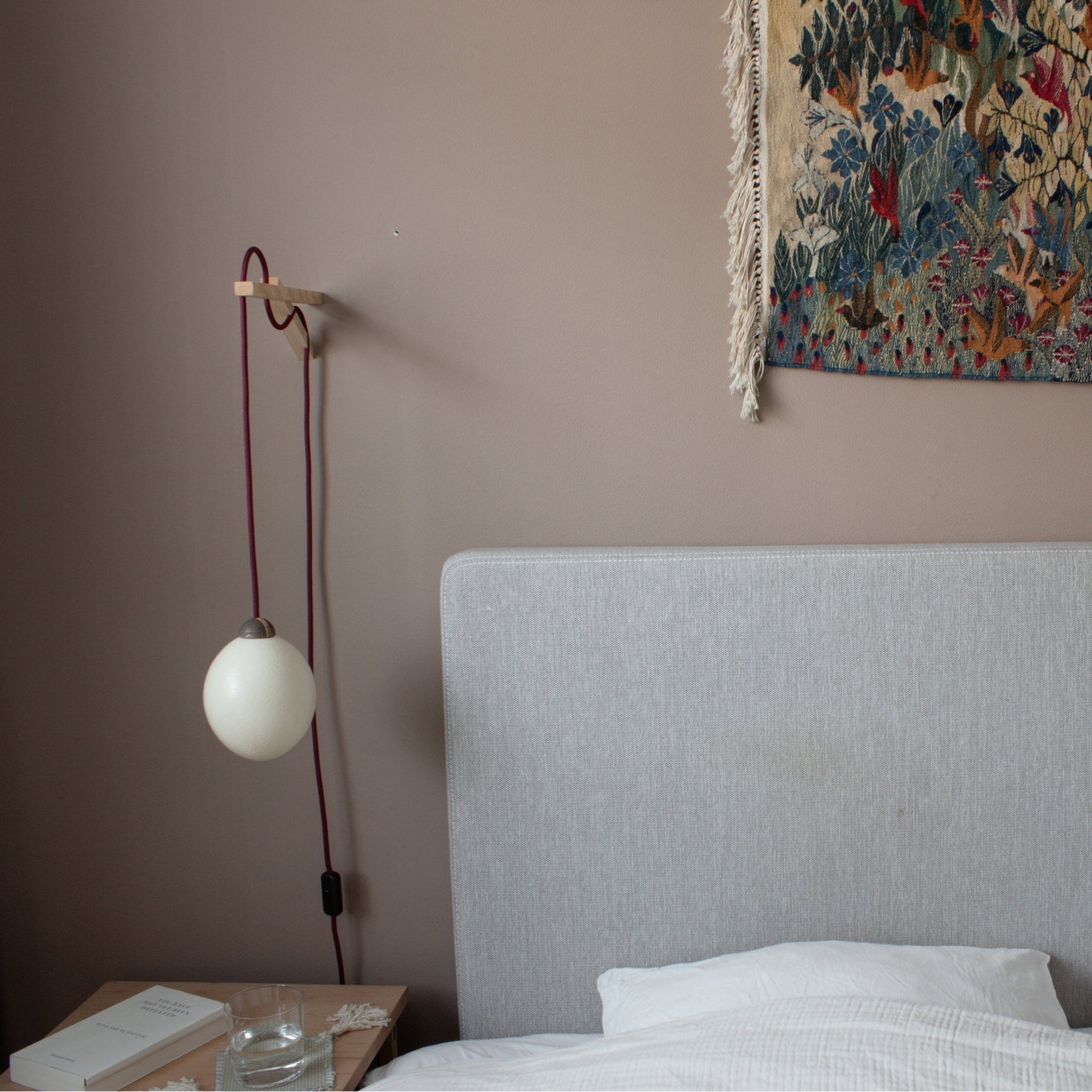 An ostrich egg hangs lightly within a sculptural wooden frame, casting a soft, diffused glow. The egg is gently topped with a turned cap and supported by a vertical maple wooden structure.