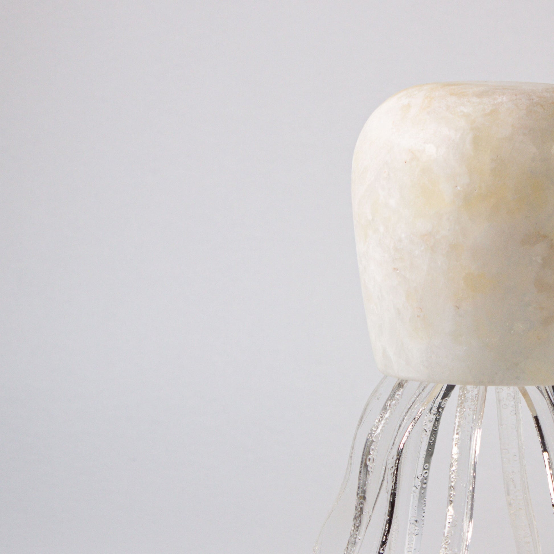 White alabaster (hand-carved) & heat-textured clear acrylic