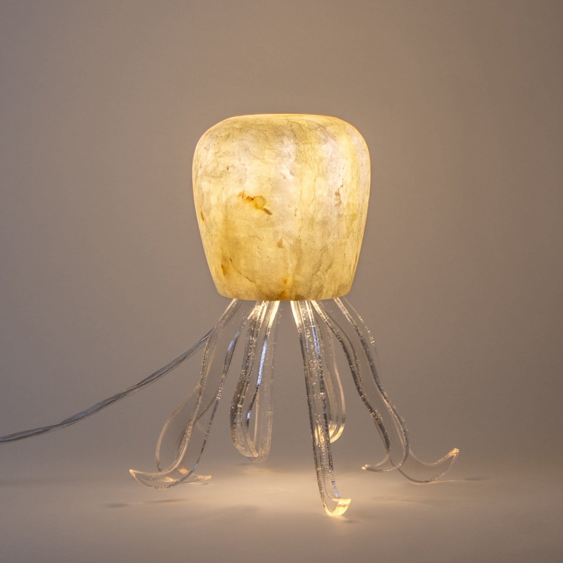 When lit, Seeba emits a soft, ambient glow that reveals the alabaster’s smooth surface and delicate veining. The clear acrylic legs catch and carry the light, adding a subtle luminosity to the base.