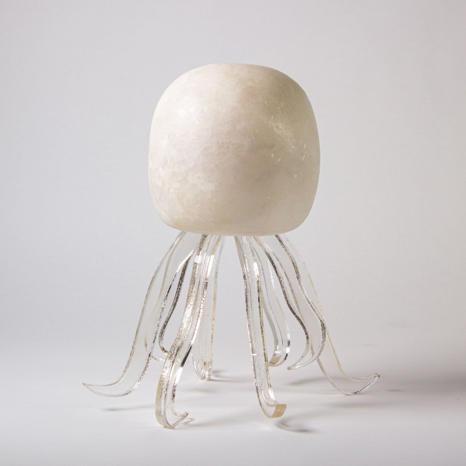 White alabaster (hand-carved) & heat-textured clear acrylic